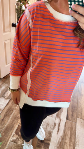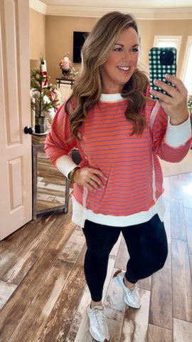 This striped top features a relaxed fit with drop shoulders, soft, breathable fabric and coral & light lavender stripes. It’s perfect for everyday wear—whether you’re running errands, grabbing coffee, or lounging in comfort. Pair it with denim and sneakers for a laid-back look you’ll reach for again and again!